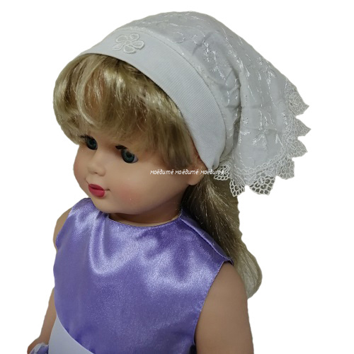 Косынка на трикотажной рибане, без завязок. Одевается как шапочка, но фасон как у косынки. Выполнена из шитья и украшена кружевом.