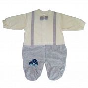 Комбинезон для мальчиков из велюра, с закрытыми ножками, с длинным рукавом на манжете, без воротничка, спереди и между ножек на кнопочках. Украшен имитацией подтяжек и пришитой "бабочкой". Верх молочного цвета, штанишки серого цвета.