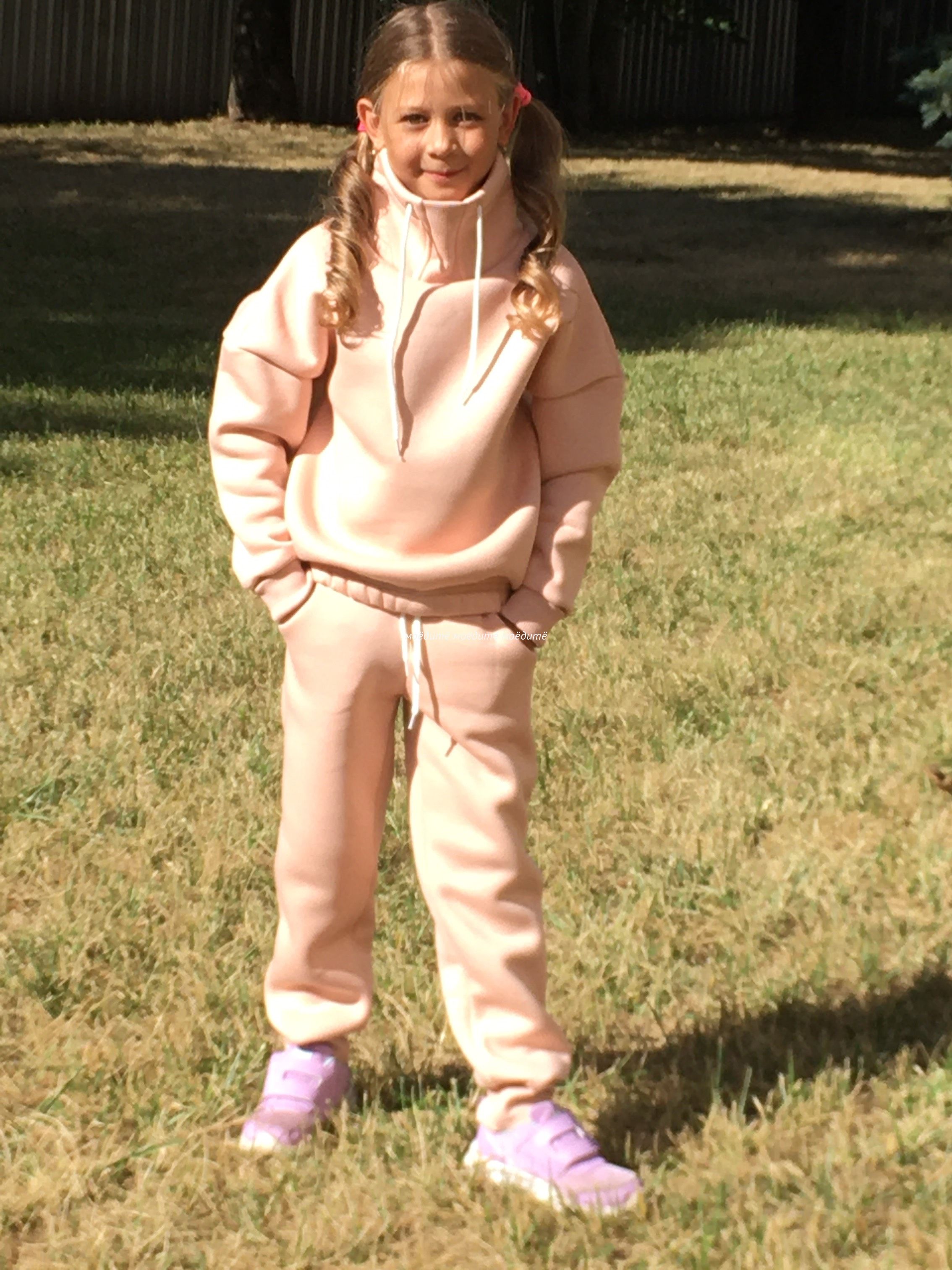 Костюм выполнен из футера 3-хнитки с начёсом. Состоит из свитшота и брюк. Брюки сверху на широкой резинке и со шнурком, снизу на манжете с отворотом. Свитшот с воротником-стойкой, украшен шнурком, снизу вставлена резинка, рукава на манжетах с отворотом.